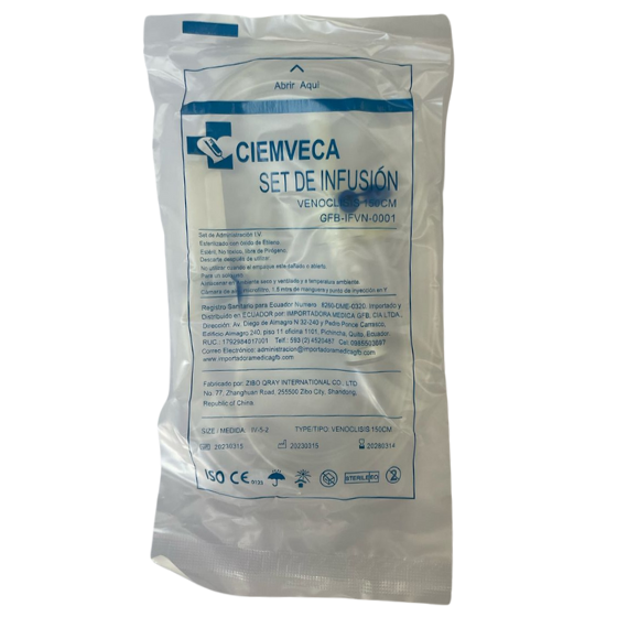 POLIVINIL, CÁMARA CUENTAGOTAS, 20 GOTAS/ML, FILTRO DE 15 MICRAS, LÍNEA 150 CM DE LONGITUD, CONECTOR LUER LOCK, REGULADOR DE FLUJO ROLLER, PUERTO DE ACCESO EN Y, PUNZÓN UNIVERSAL CON TAPA DE PROTECCIÓN, LIBRE DE LÁTEX, ESTÉRIL, DESCARTABLE